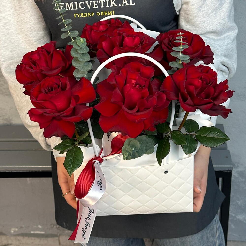 Роза красная - 7 шт. Эвкалипт - 2 шт. Флористическая губка - 2 шт. сумочка белая - 1 шт. лента бордовая и белая - 2 шт.