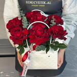 Композиция 189 «Алое прикосновение» ❤️🤍 Роскошная композиция из 7 алых роз — символ страсти, любви и искренних эмоций ❤️ Свежий эвкалипт придаёт лёгкость и стиль, а белая сумочка подчёркивает утончённость букета. Бордовая и белая ленты создают эффект дорогого, запоминающегося подарка ✨ Идеальный выбор, чтобы выразить чувства красиво и без лишних слов 🌹