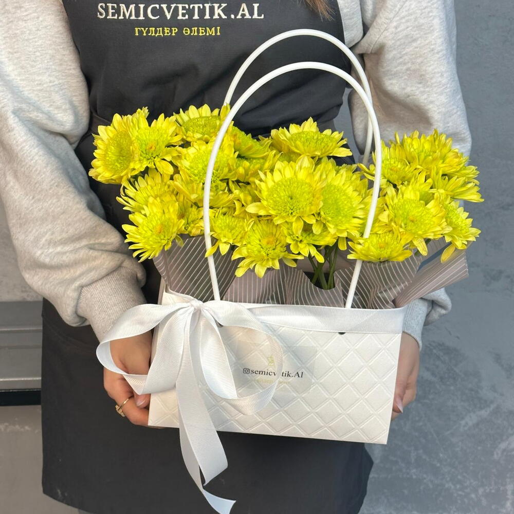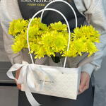 Хризантема кустовая желтая - 5 шт. Лента белая - 1 шт. Флористическая губка - 2 шт. сумочка белая - 1 шт. аква бумага матовая - 2 шт.