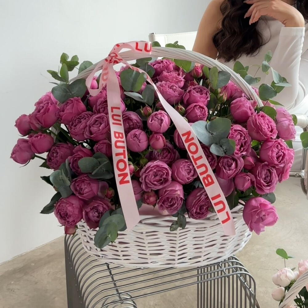Нежная композиция из кустовых пионовидных роз с эвкалиптом в корзине, наполненная теплом и мягкостью. Выбирают, когда хочется подарить не просто цветы, а ощущение заботы