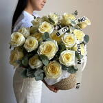 Эвкалипт - 2 шт. Кашпо - 1 шт. пионовидные розы - 25 шт.