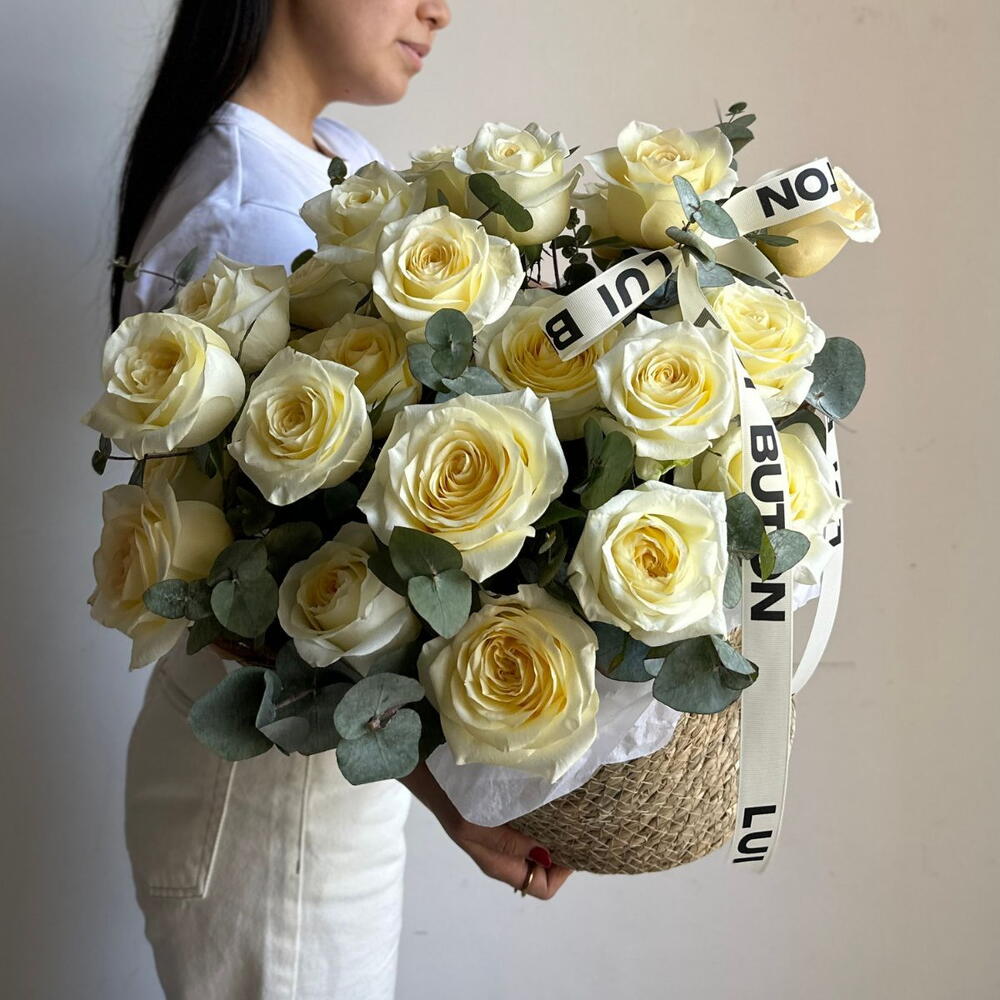 Эвкалипт - 2 шт. Кашпо - 1 шт. пионовидные розы - 25 шт.