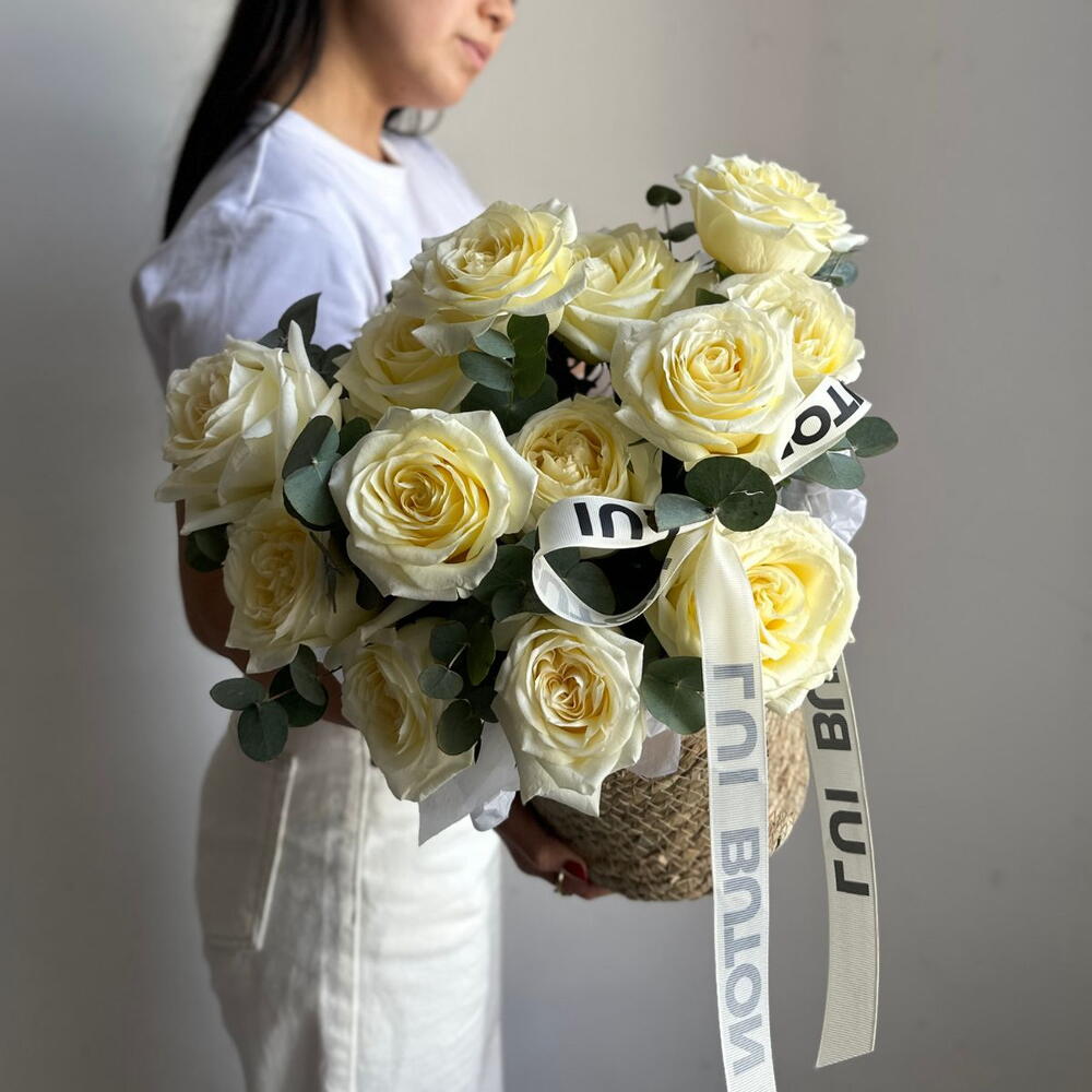 Эвкалипт - 1 шт. Кашпо - 1 шт. пионовидные розы - 15 шт.