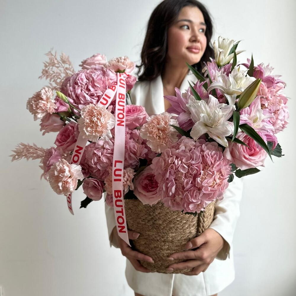 Гортензия - 3 шт. Лилия - 2 шт. Эустома - 4 шт. Диантус - 5 шт. рускус сухоцвет - 2 шт. пионовидные розы - 5 шт.
