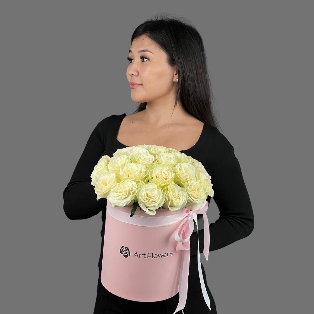 **Композиция «Белоснежная солнечность»** 25 белых в оранжевой коробке олицетворяют чистоту, искренность и благородство. Этот букет подойдёт для признания в самых светлых чувствах