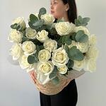 Композиция из белых роз с эвкалиптом в кашпо. Белые оттенки и изысканная подача делают его идеальным для праздника или просто приятного сюрприза