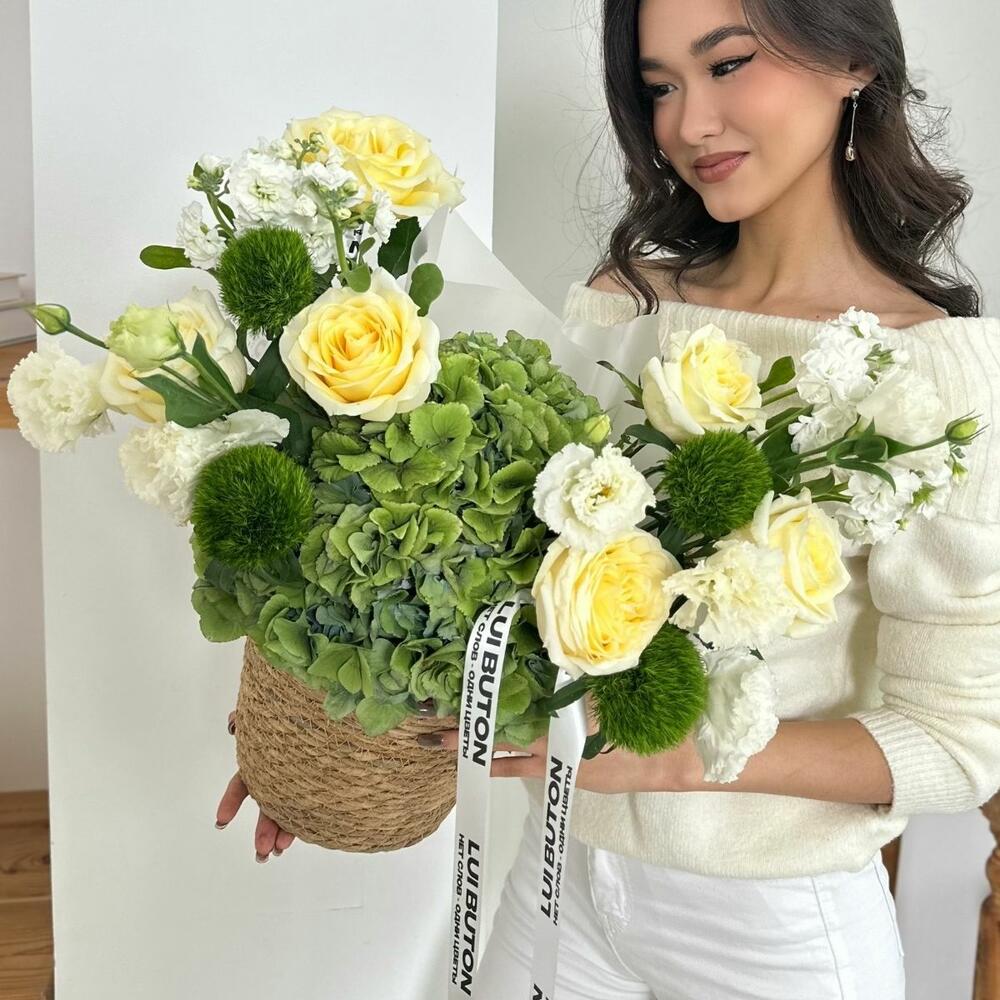 Гортензия - 1 шт. Маттиола - 2 шт. Эустома - 2 шт. пионовидные розы - 6 шт. диантус мох - 4 шт.