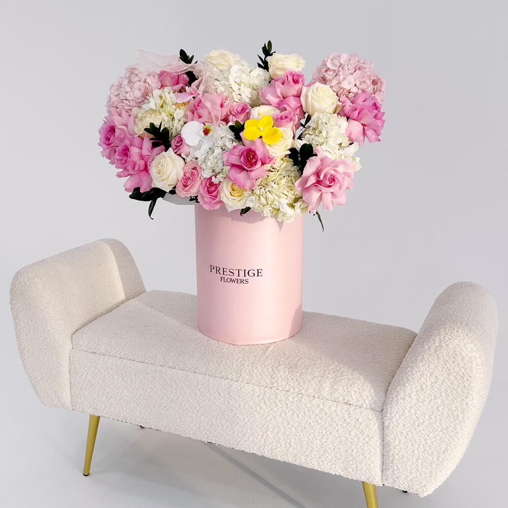 Рускус - 5 шт. Орхидея искусственная - 1 шт. гортензии микс - 7 шт. розы голландия - 21 шт. гигант коробка - 1 шт.
