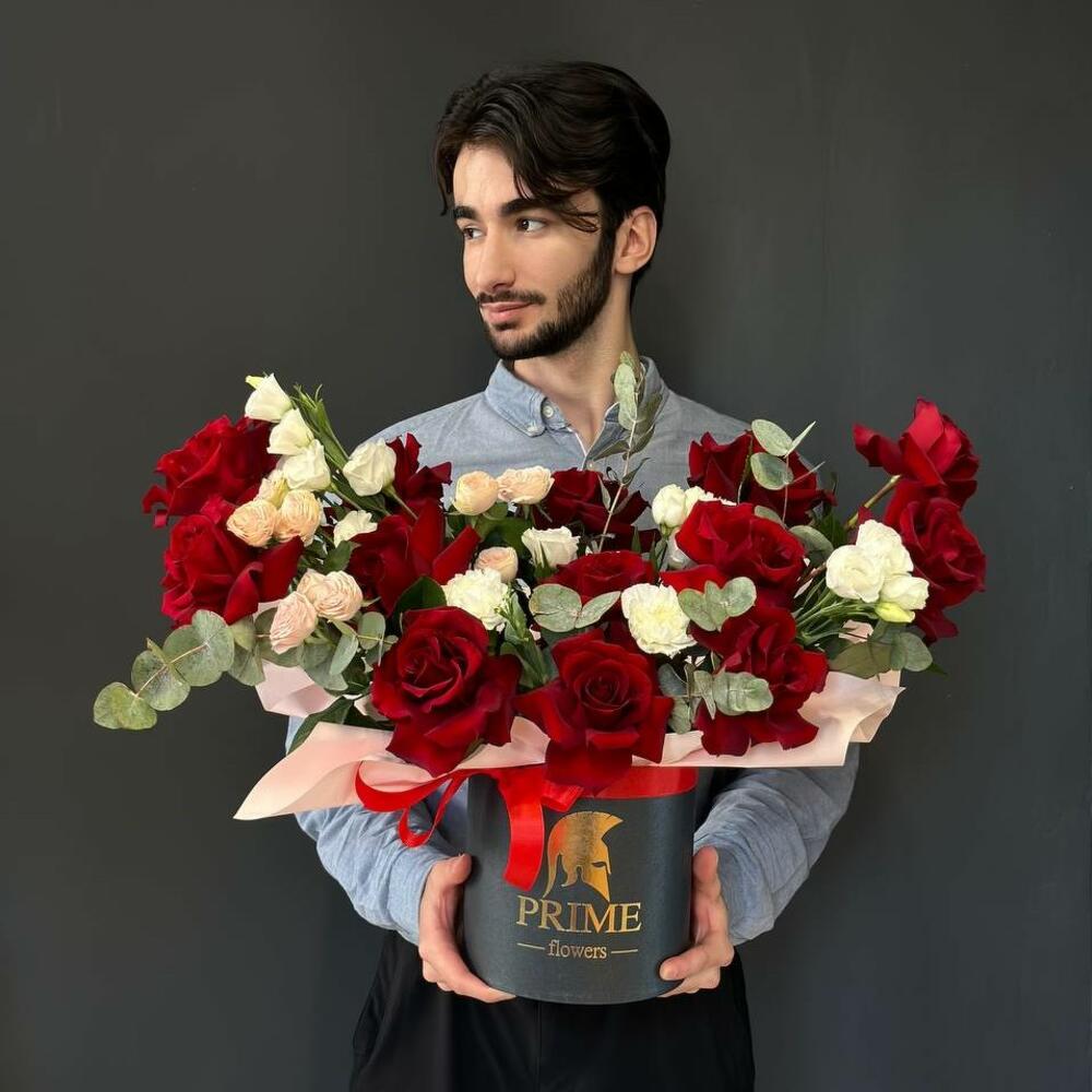 Эвкалипт - 2 шт. Роза - 13 шт. Эустома - 3 шт. спрей розы - 4 шт.
