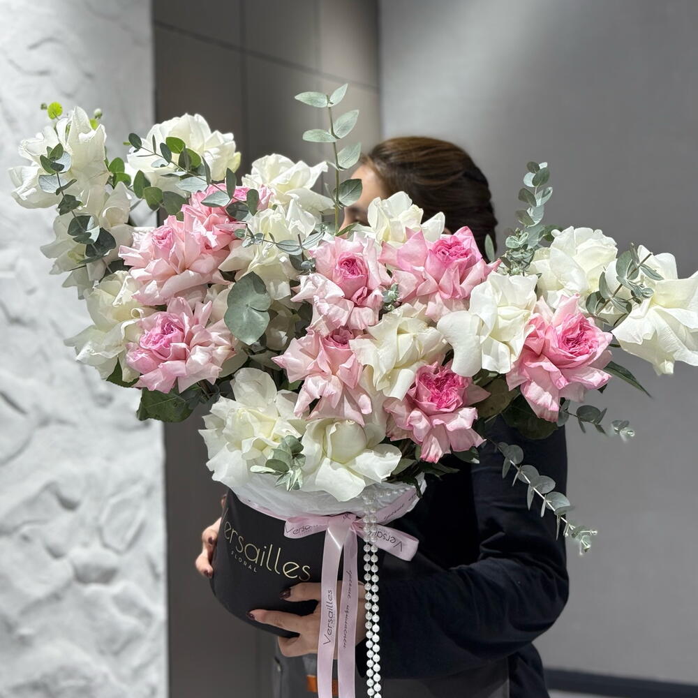 Роза - 19 шт. Коробка шляпная - 1 шт. Эвкалипт Цинерея - 5 шт.