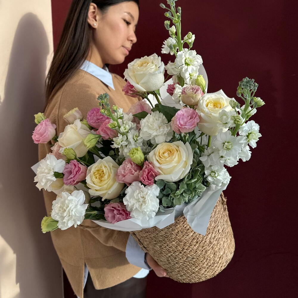 Гортензия - 1 шт. Маттиола - 3 шт. Эустома - 5 шт. Диантус - 4 шт. пионовидные розы - 5 шт.
