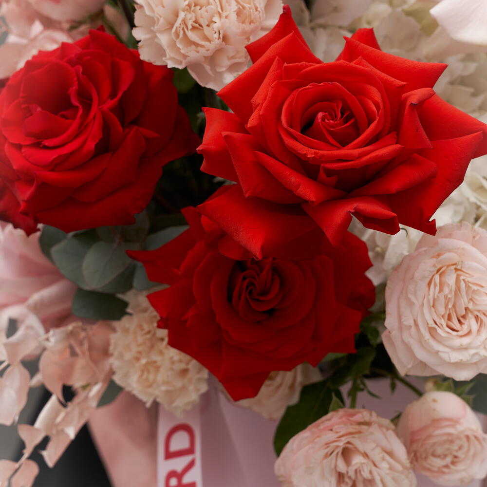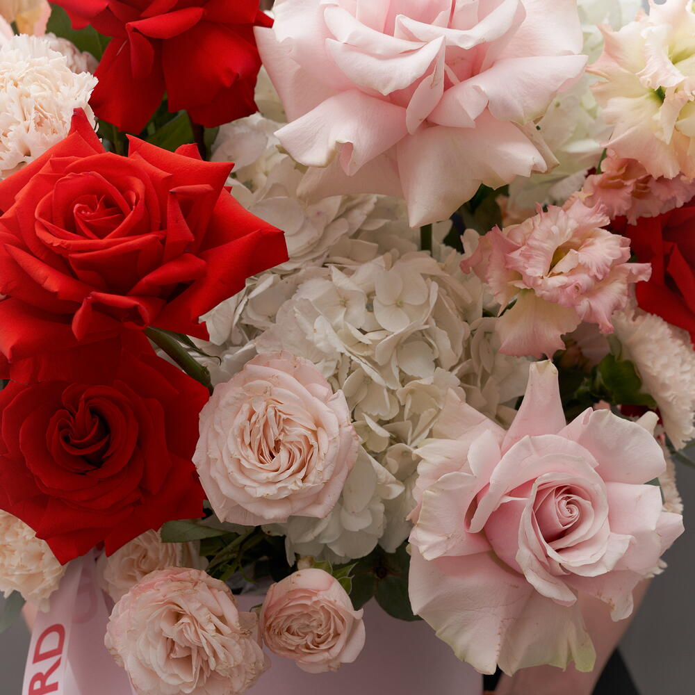 Гортензия - 2 шт. Роза кустовая - 3 шт. Эвкалипт - 2 шт. Роза Эквадор - 15 шт. Эустома - 1 шт. Диантус - 5 шт. рускус стабизированный - 1 шт.