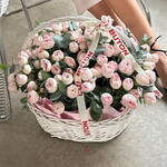 Нежная композиция из кустовых пионовидных роз с эвкалиптом в корзине, наполненная теплом и мягкостью. Выбирают, когда хочется подарить не просто цветы, а ощущение заботы