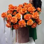 Коробка бархатная - 1 шт. Упаковка дизайнерская - 5 шт. Роза оранжевая - 51 шт. Оазис флористический - 4 шт.