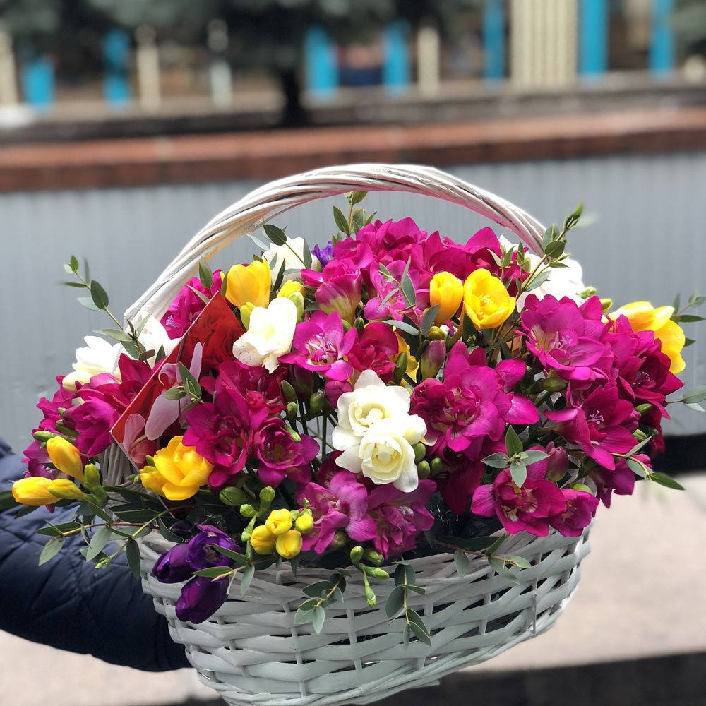 Корзина - 1 шт. Фрезия - 51 шт. Эвкалипт - 1 шт.