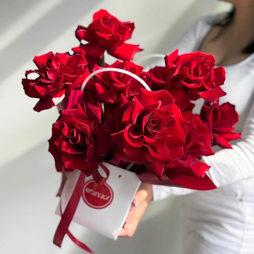 Роза Голландская - 9 шт. Упаковка дизайнерская - 1 шт. Оазис флористический - 1 шт. сумочка 1.2 - 1 шт.