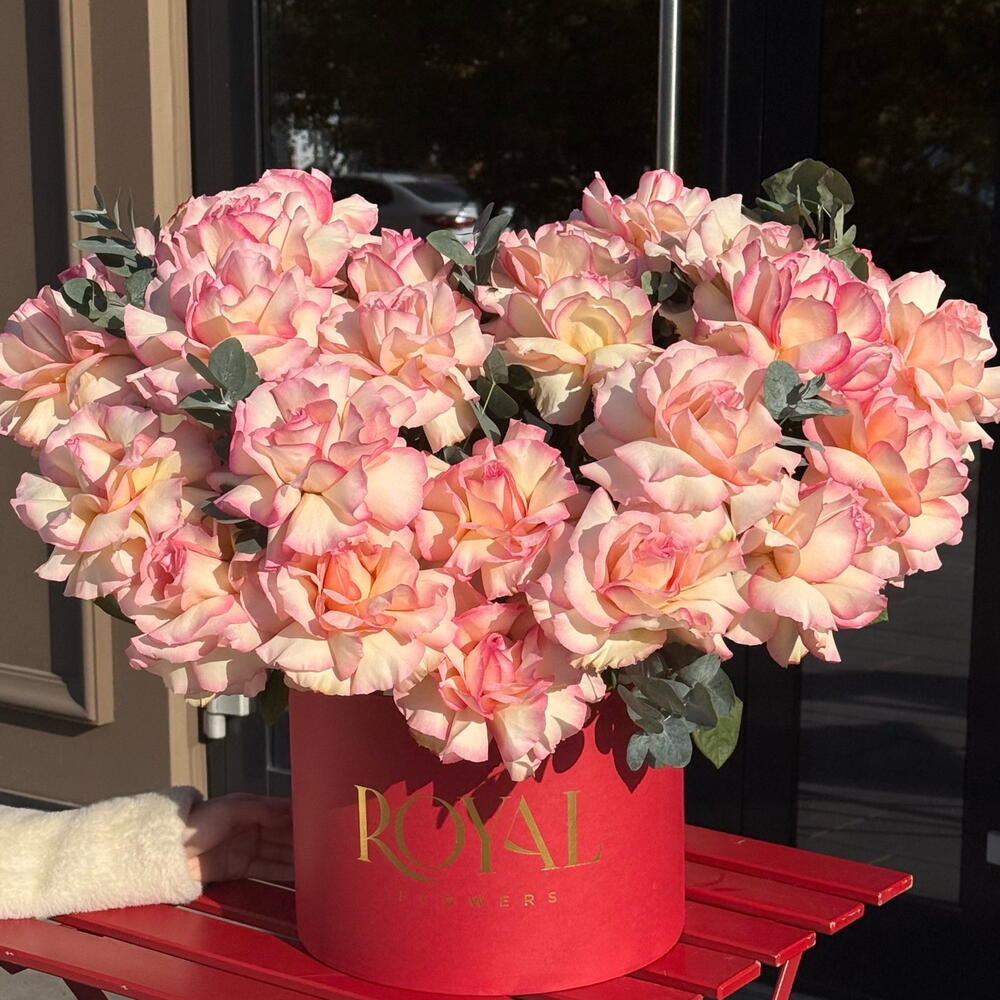 Эвкалипт Микс - 2 шт. Оазис флористический - 3 шт. французские розы - 25 шт. красная коробка - 1 шт.