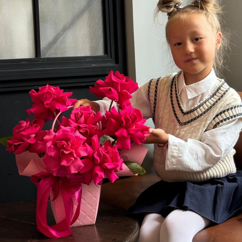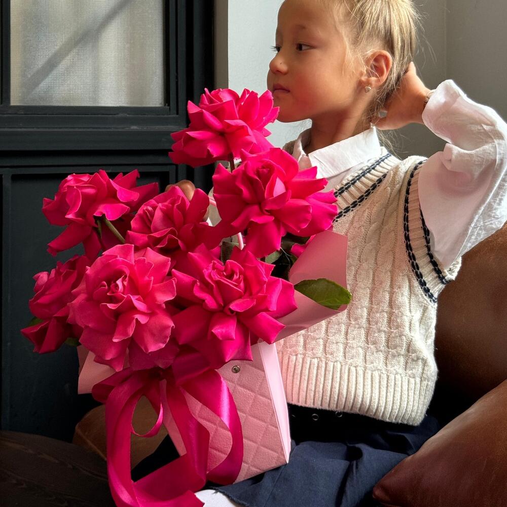 Роза - 9 шт. Упаковка дизайнерская - 2 шт. Сумочка - 1 шт. Оазис флористический - 1 шт.