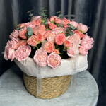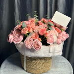 Обворожительная композиция из роз джульетты и жизель в элегантной корзине. Семь цветов джульетты изысканного пудрового оттенка элегантно сочетаются с пятью кустовыми розами жизель, подчеркивая природную красоту и великолепие этих цветов. Прекрасный подарок, способный украсить любое помещение и доставить настоящее удовольствие.