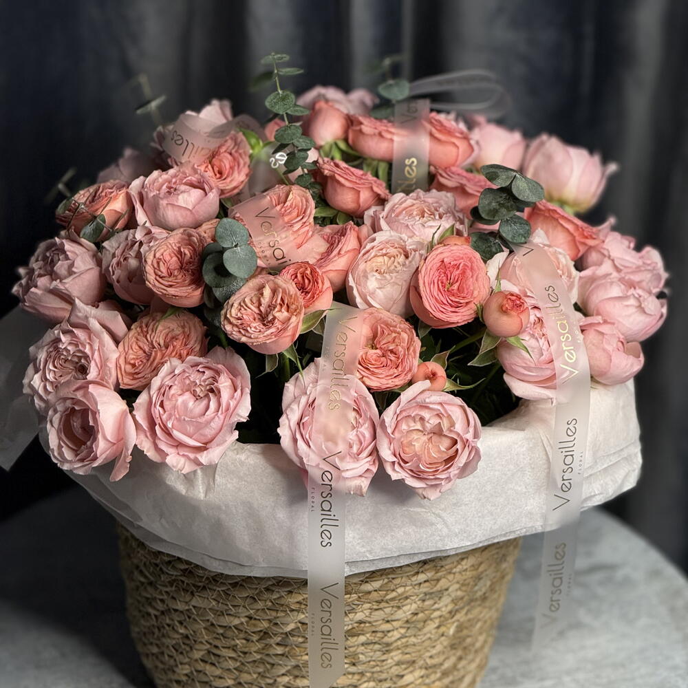 Композиция из кустовых роз премиум класса в плетеном кашпо S