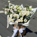 Лизиантус - 15 шт. Эвкалипт - 3 шт. Оазис флористический - 2 шт. кашпо м - 1 шт.