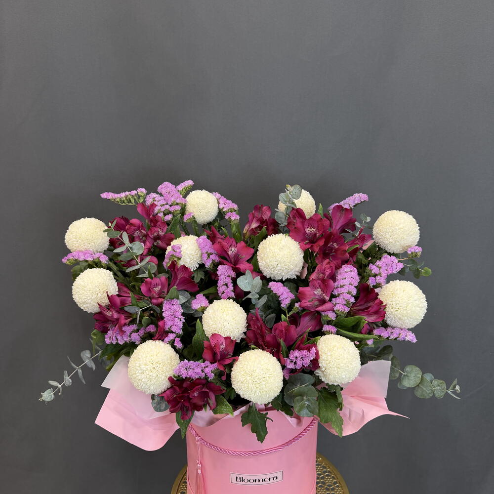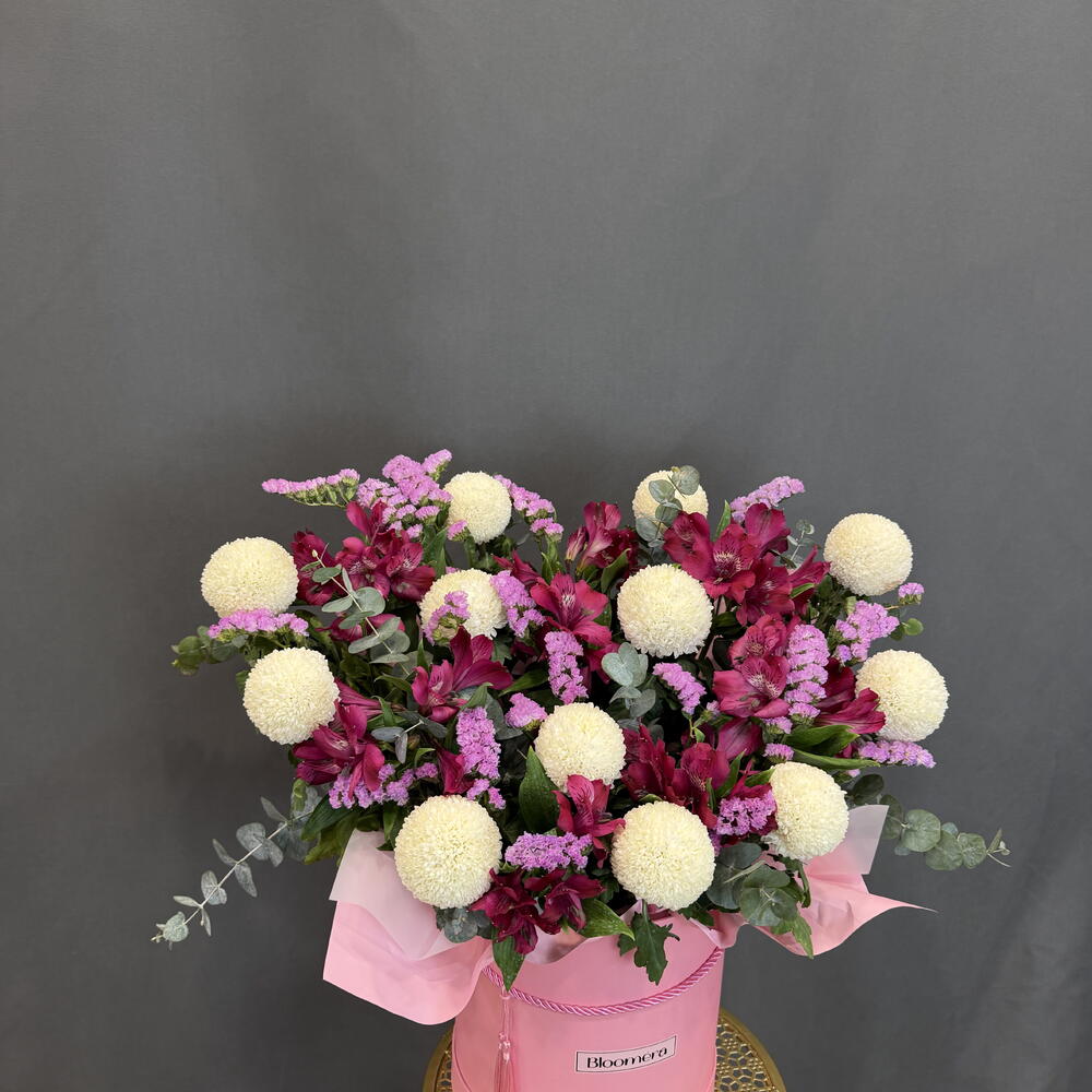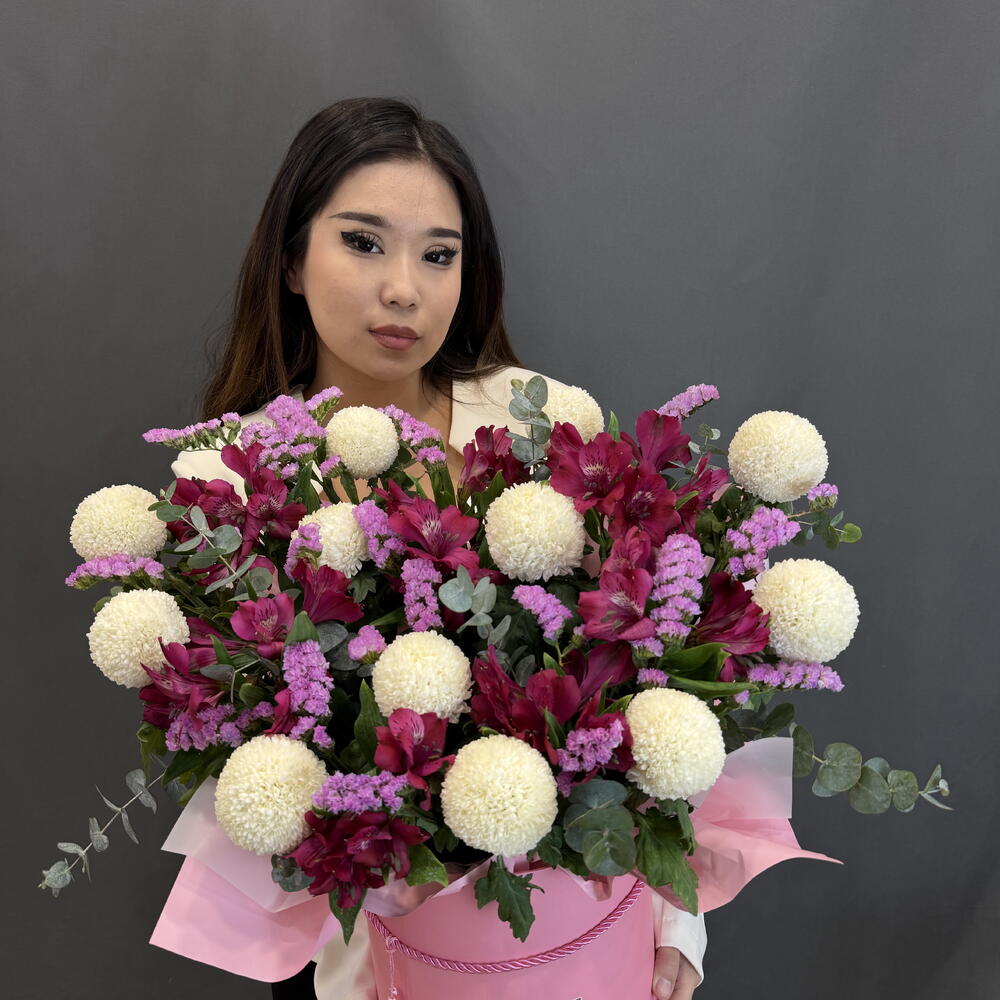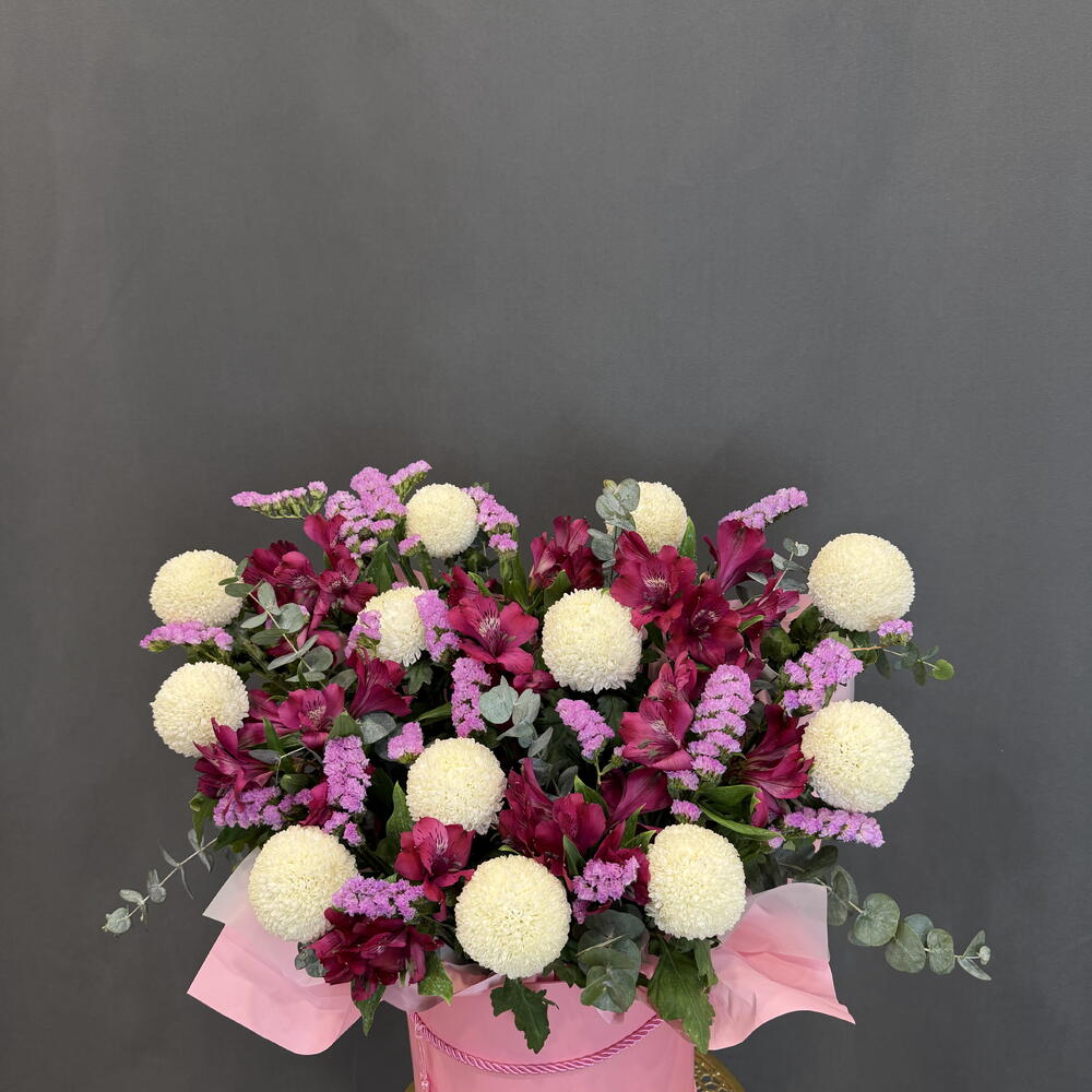 Альстромерия - 8 шт. Статица - 9 шт. Эвкалипт - 5 шт. Коробка - 1 шт. момоко - 12 шт.