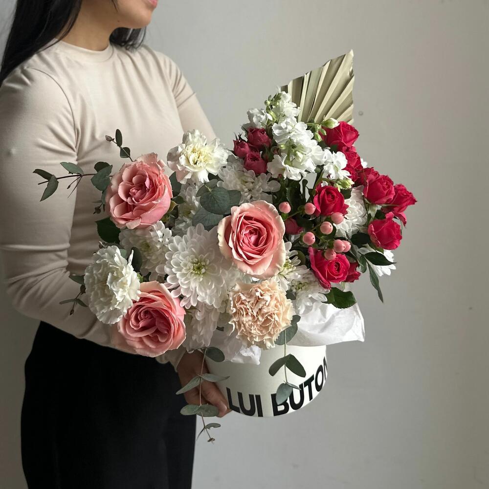 Гиперикум - 1 шт. Маттиола - 1 шт. Эвкалипт - 1 шт. хризантемы - 4 шт. голландские розы - 3 шт. кустовые розы - 2 шт. диантусы - 3 шт. пальмовый лист - 1 шт.