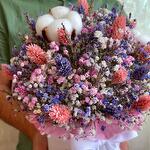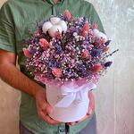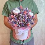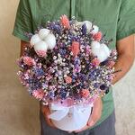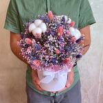 Лаванда - 15 шт. Хлопок - 3 шт. Фаларис - 30 шт. Оазис флористический - 1 шт. Коробка d15 - 1 шт. гипсофила (сухоцвет) - 9 шт.