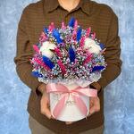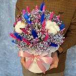 Хлопок - 3 шт. Лента атласная - 1 шт. Лагурус (сухоцвет) - 15 шт. Пшеница (сухоцвет) - 15 шт. Оазис сухой - 1 шт. Коробка d15 - 1 шт. гипсофила (сухоцвет) - 7 шт.