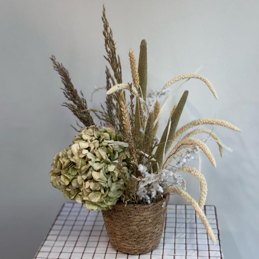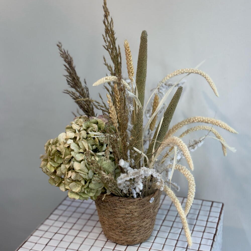 Оазис флористический - 1 шт. Аспарагус заснеженый - 1 шт. Пшеница (сухоцвет) - 7 шт. гортензия сухоцвет - 1 шт. сухоцвет пампас кортадерия - 3 шт. Паникум Фоунтан - 9 шт. пампас сетария - 7 шт.