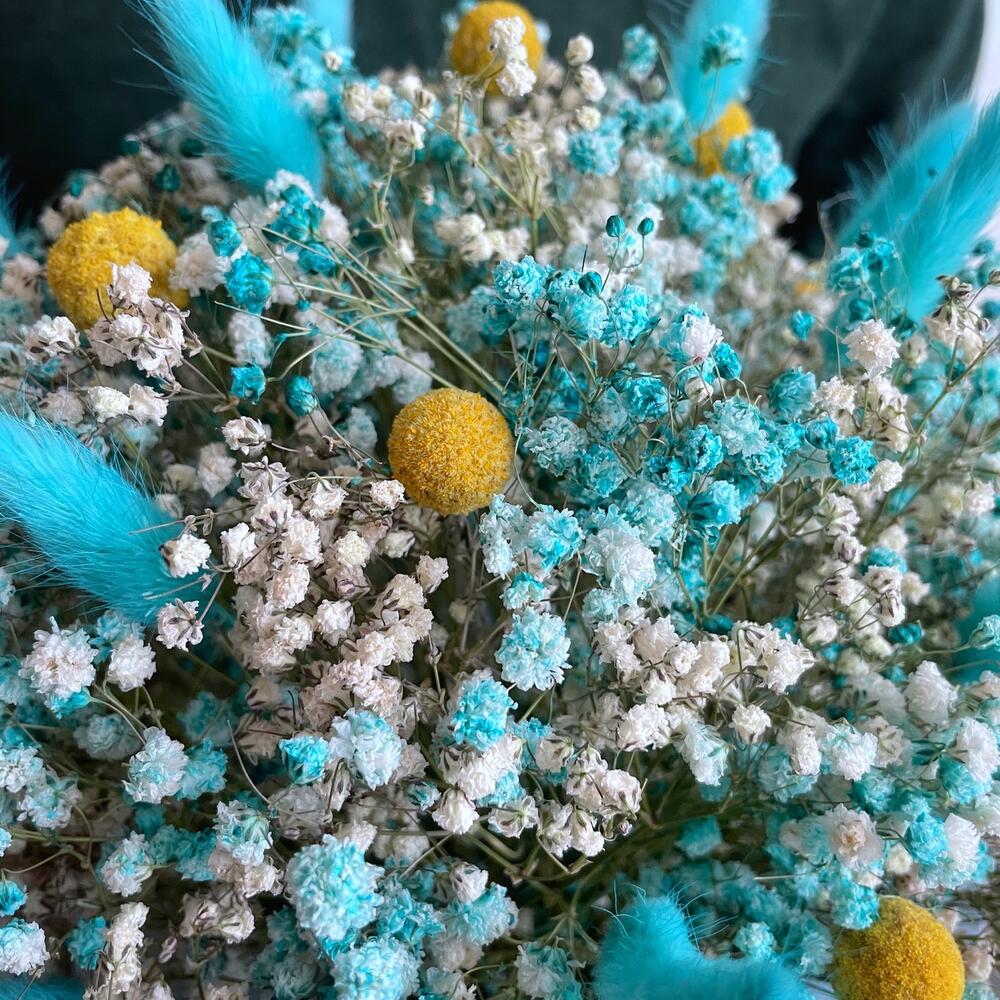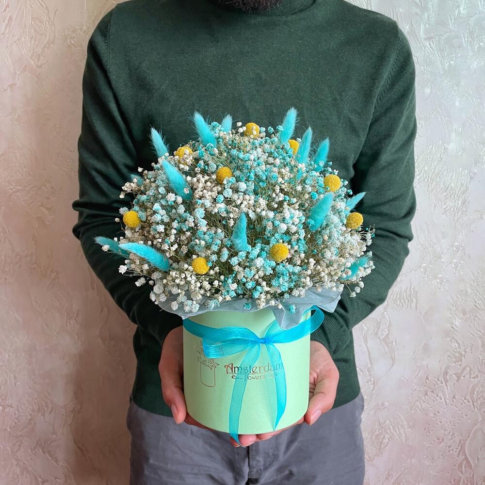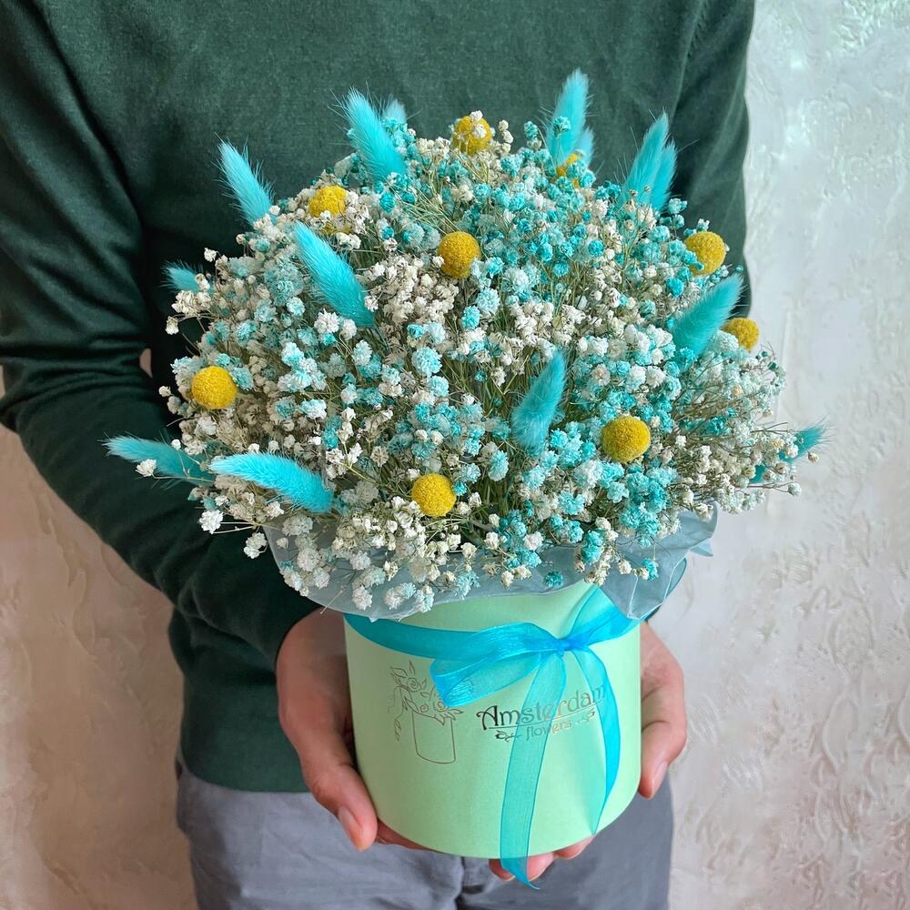 Гипсофила - 7 шт. Краспедия - 15 шт. Оазис - 1 шт. Лагурус - 17 шт. Коробка d15 - 1 шт.