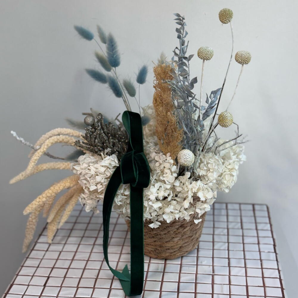 Лагурус - 21 шт. Оазис флористический - 1 шт. Ветки заснеженые - 1 шт. гортензия сухоцвет - 2 шт. рускус стабилизированный - 1 шт. бруния сухоцвет - 1 шт. амарант сухоцвет - 10 шт. Краспедия Стабилизированная Краш Светло Зеленая - 5 шт.