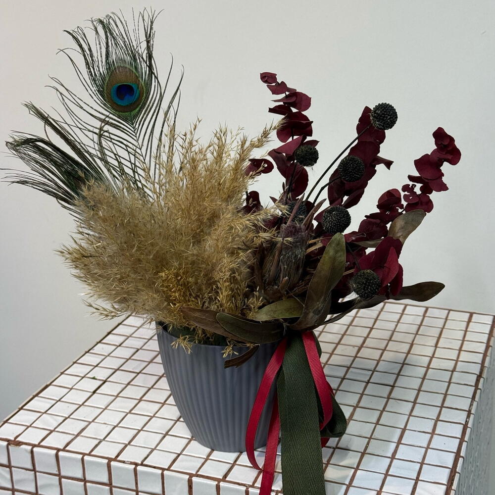 Оазис флористический - 1 шт. Эвкалипт стабилизированный - 2 шт. протея сухоцвет - 1 шт. краспедия сухоцвет - 6 шт. пампас сетария - 2 шт. кашпо 2.9 - 1 шт. ветки павлина - 2 шт.