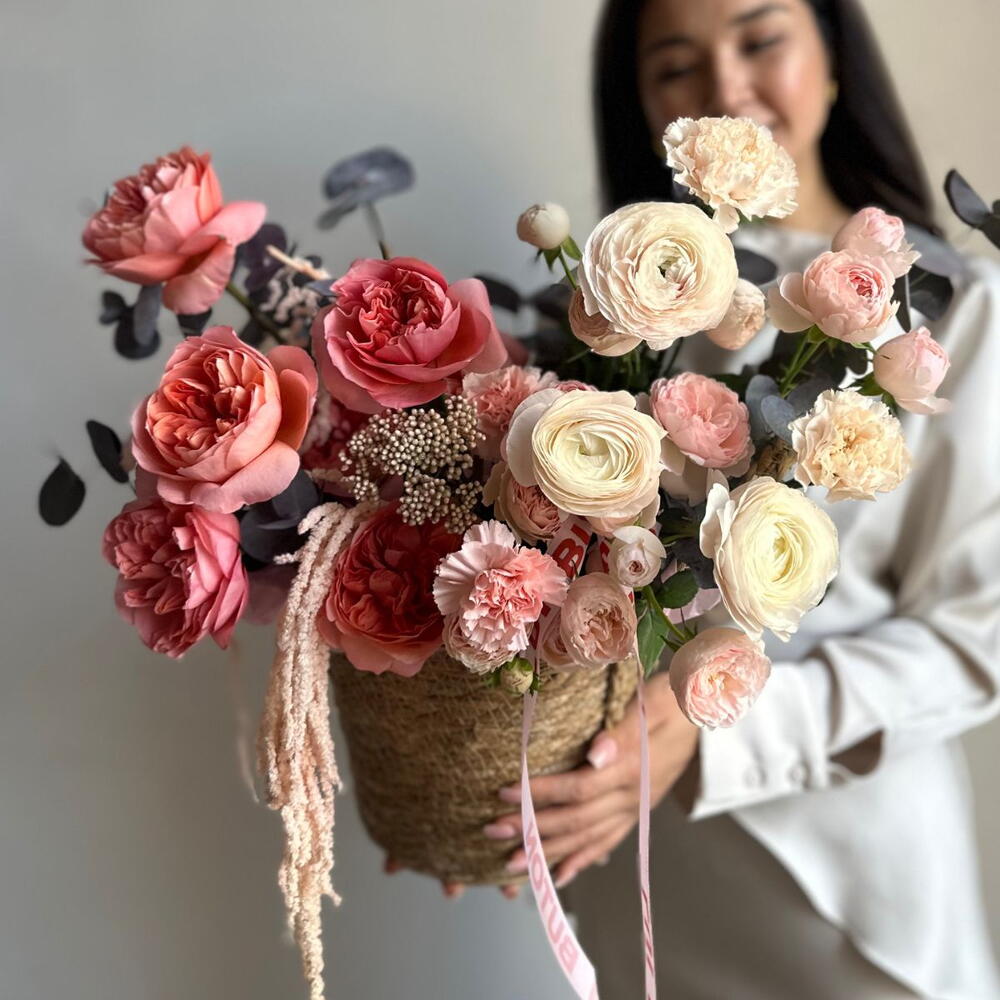 Озотамнус - 1 шт. Эвкалипт - 2 шт. Диантус - 3 шт. Ранункулюс - 3 шт. Амарант - 1 шт. пионовидные розы - 5 шт. кустовые розы - 4 шт.