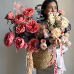 Эвкалипт - 3 шт. Диантус - 3 шт. Ранункулюс - 3 шт. Амарант - 1 шт. рускус сухоцвет - 1 шт. пионовидные розы - 9 шт. кустовые розы - 5 шт.