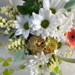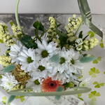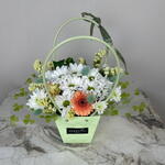 Гербера - 1 шт. Диантус - 1 шт. Оазис флористический - 1 шт. зелень фисташки ветка - 1 шт. статица ветка - 2 шт. бумага пленка - 1 шт. хризантема кустовая кенеди - 1 шт. сумочка xs картон - 1 шт. зелень клен ветка - 2 шт. сухоцвет ланурус - 5 шт.