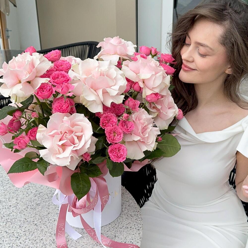 Роза кустовая - 5 шт. Роза - 11 шт. Коробка - 1 шт. Упаковка дизайнерская - 2 шт. Оазис флористический - 1 шт.