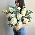 Воздушная композиция из эустом и эвкалипта в кашпо наполненная свежестью. Такой подарок вызывает только тёплые эмоции.