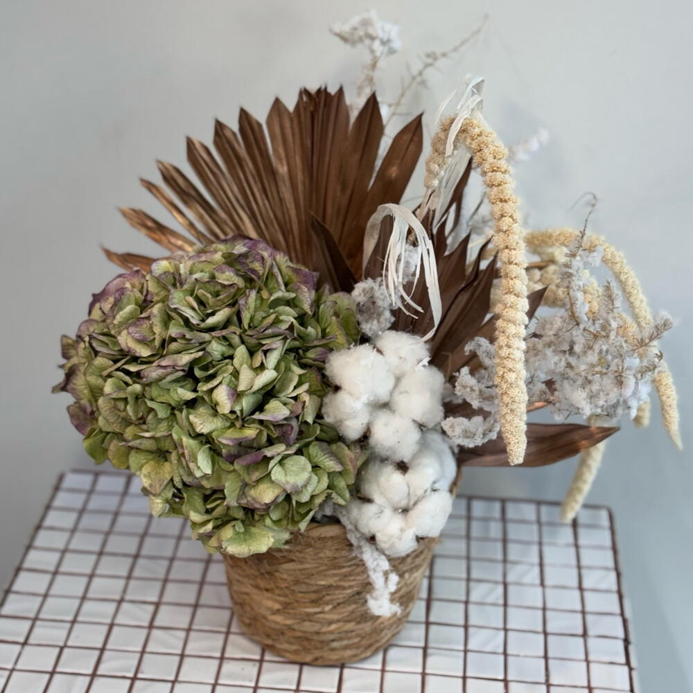 Оазис флористический - 1 шт. Хлопок натуральный - 3 шт. Аспарагус заснеженый - 1 шт. гортензия сухоцвет - 1 шт. лист пальмы сухоцвет - 2 шт. пампас сетария - 5 шт.