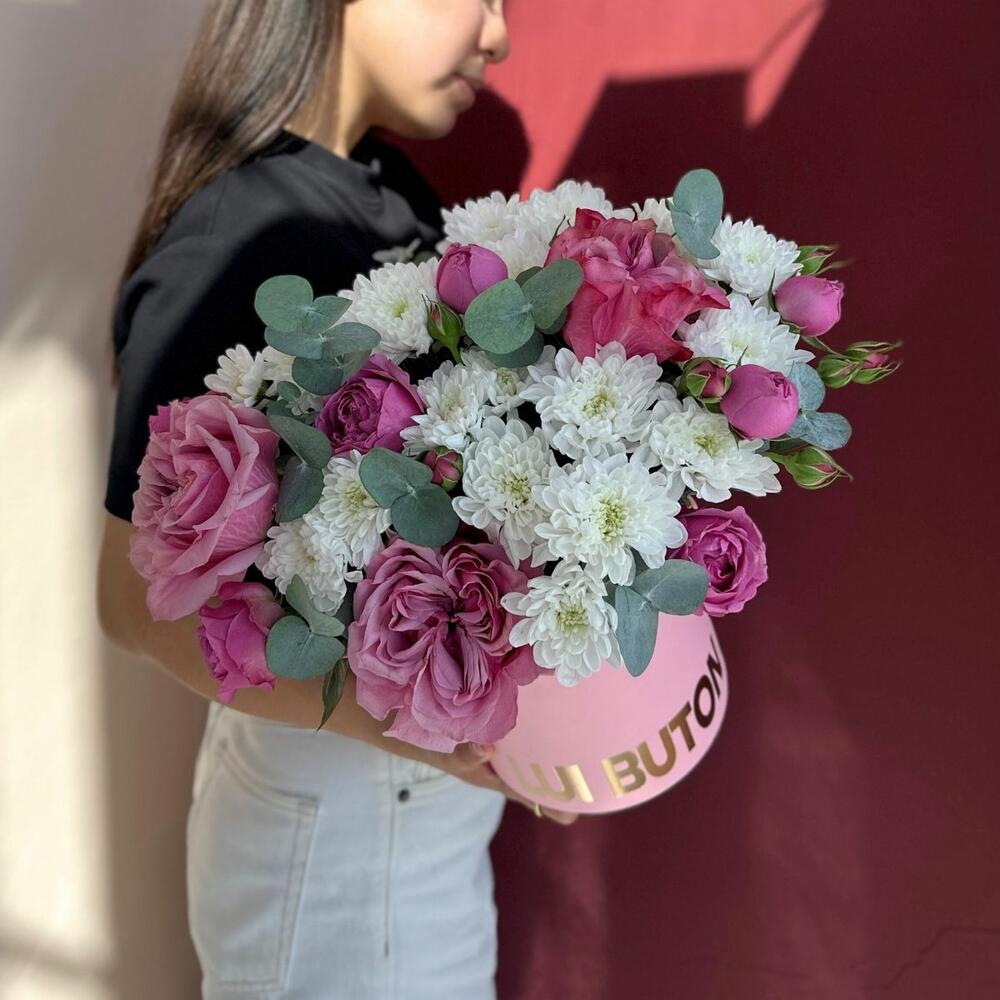 Эвкалипт - 1 шт. хризантемы - 4 шт. пионовидные розы - 3 шт. кустовые розы - 2 шт.