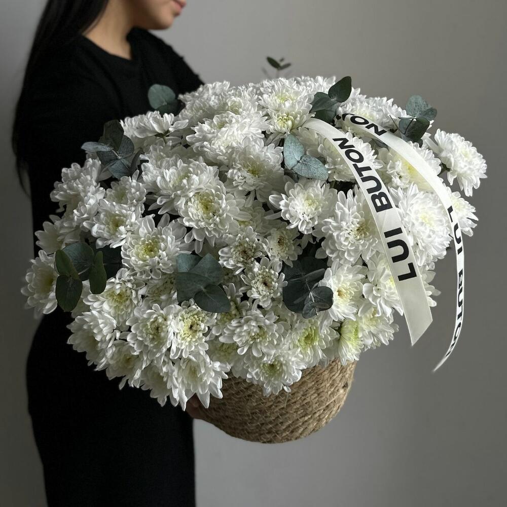Энергичные и утончённые цветы покорят сердце любого ценителя природы. В состав цветочной композиции в корзине входят семь веток ароматного эвкалипта и двадцать одна изящная хризантема. Каждый из этих роскошных бутонов букета был тщательно отобран и собран в комбинации, которая создает идеальную гармонию форм и оттенков. Это уникальный подарок, способный запомниться навсегда.