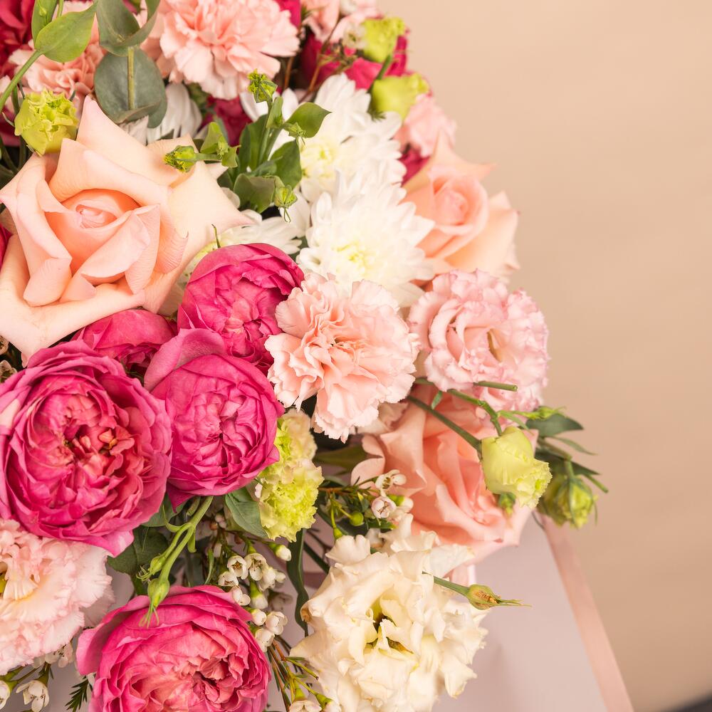 Ваксфлауэр - 2 шт. Лизиантус - 4 шт. Эвкалипт - 2 шт. Роза - 6 шт. Хризантема - 4 шт. Гвоздика - 5 шт. Коробка - 1 шт. джульетта - 5 шт.