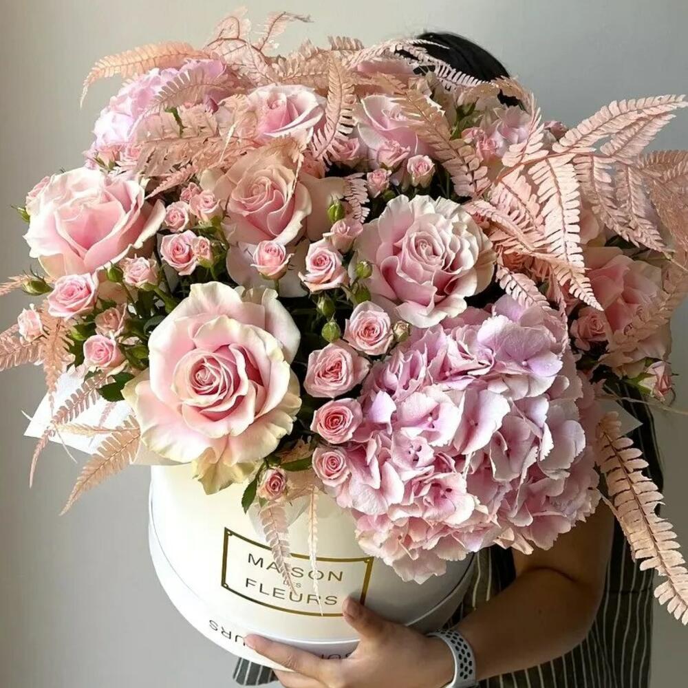 Гортензия - 2 шт. розы - 13 шт. кустовые розы - 5 шт. стабилизированый папоротник - 2 шт.