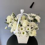 Эвкалипт - 3 шт. Роза Эквадор - 5 шт. Хризантема Ромашковая - 2 шт. Губка флористическая - 1 шт. статица сильвер - 2 шт. сумочка малая - 1 шт.
