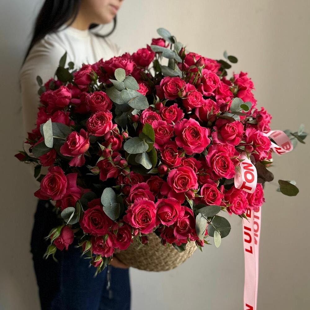 Композиция из кустовых роз с эвкалиптом в кашпо. Лёгкая, изящная и гармоничная композиция — для ценителей красоты. Она выглядит дорого, но дарит красоту и заботу
