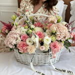 Астильба - 4 шт. Гортензия - 2 шт. Лилия - 2 шт. Роза - 7 шт. Кустовая роза - 5 шт. Эустома - 5 шт. Диантус - 5 шт. Одноголовая хризантема - 2 шт.
