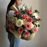 Этот шикарный ансамбль из 25 роз мягких кремовых и ярких розовых оттенков, укомплектованных 9 ветками свежего эвкалипта, идеально подойдёт для презентации как знак уважения и нежности. Сочетание цветов и ароматов в этой корзине без сомнения покорит сердца и украсит любое помещение.