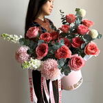 Маттиола - 2 шт. Эвкалипт - 4 шт. Хризантема момоко - 2 шт. Одноголовая хризантема - 2 шт. пионовидные розы - 13 шт.
