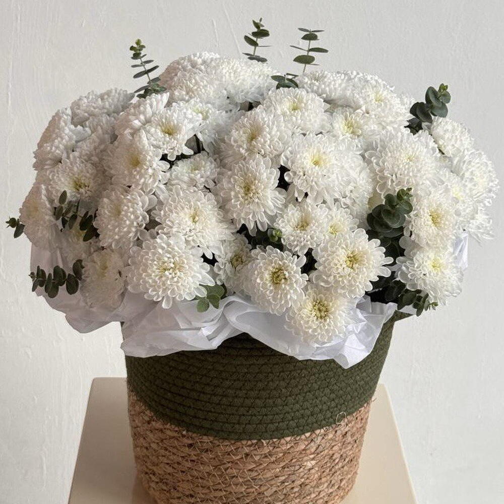 Композиция «Олив» — про спокойную, зрелую любовь. Белые кустовые хризантемы с эвкалиптом в стильном кашпо создают ощущение уюта, заботы и гармонии. Идеальный подарок, если хочется выразить чувства сдержанно, красиво и со вкусом — для дома и сердца.