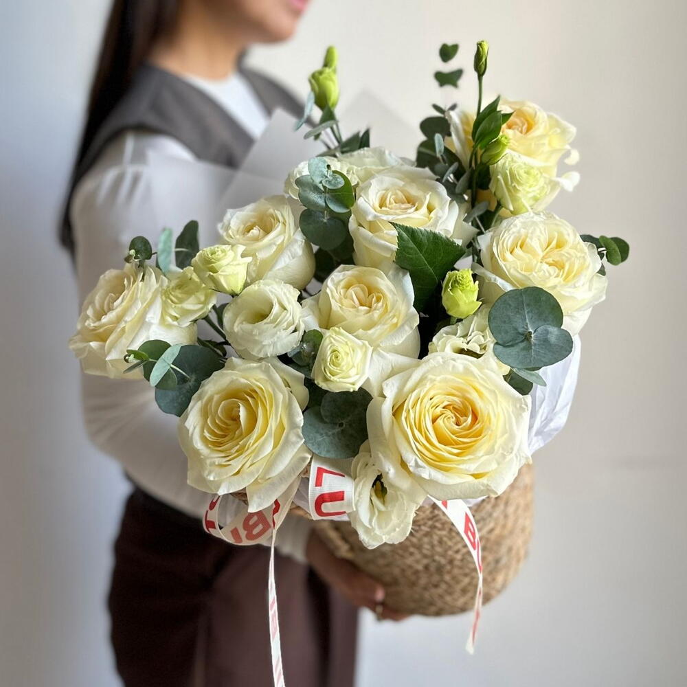 Композиция из эустом, пионовидных роз и эвкалипта в кашпо - для тех, кто ценит изысканность, аромат и гармонию оттенков